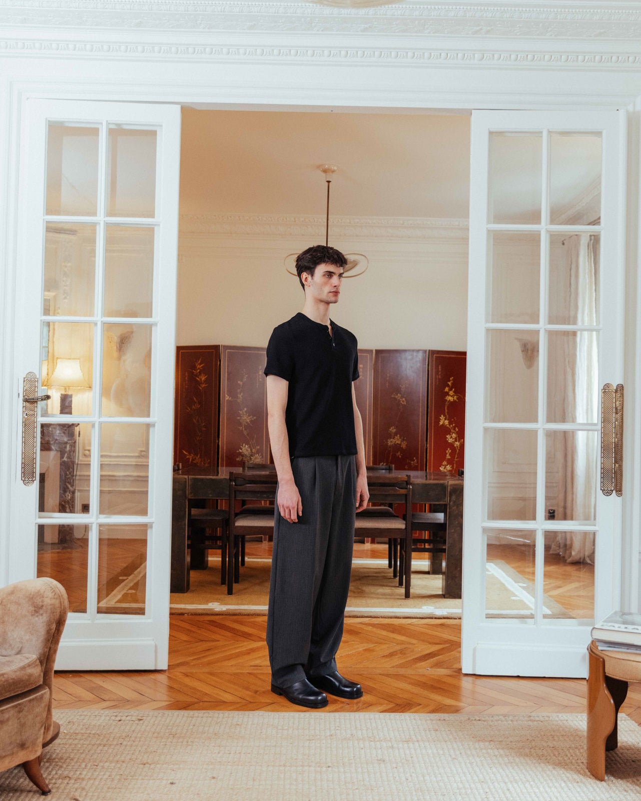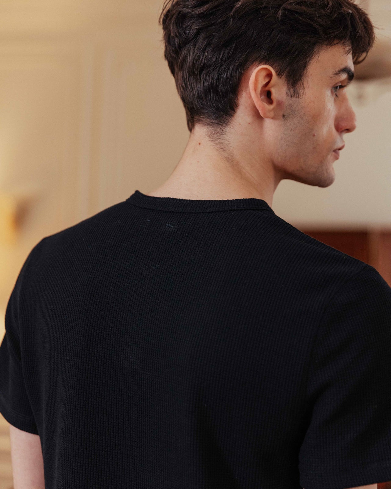 The waffle henley of a ’90s actor straight off set. Nils contours the body with a slim fit and subtle crop for a shrunken look. With the waffle texture continuing through around the neck and placket, it’s a sleek layering piece that goes beyond your regular basic.