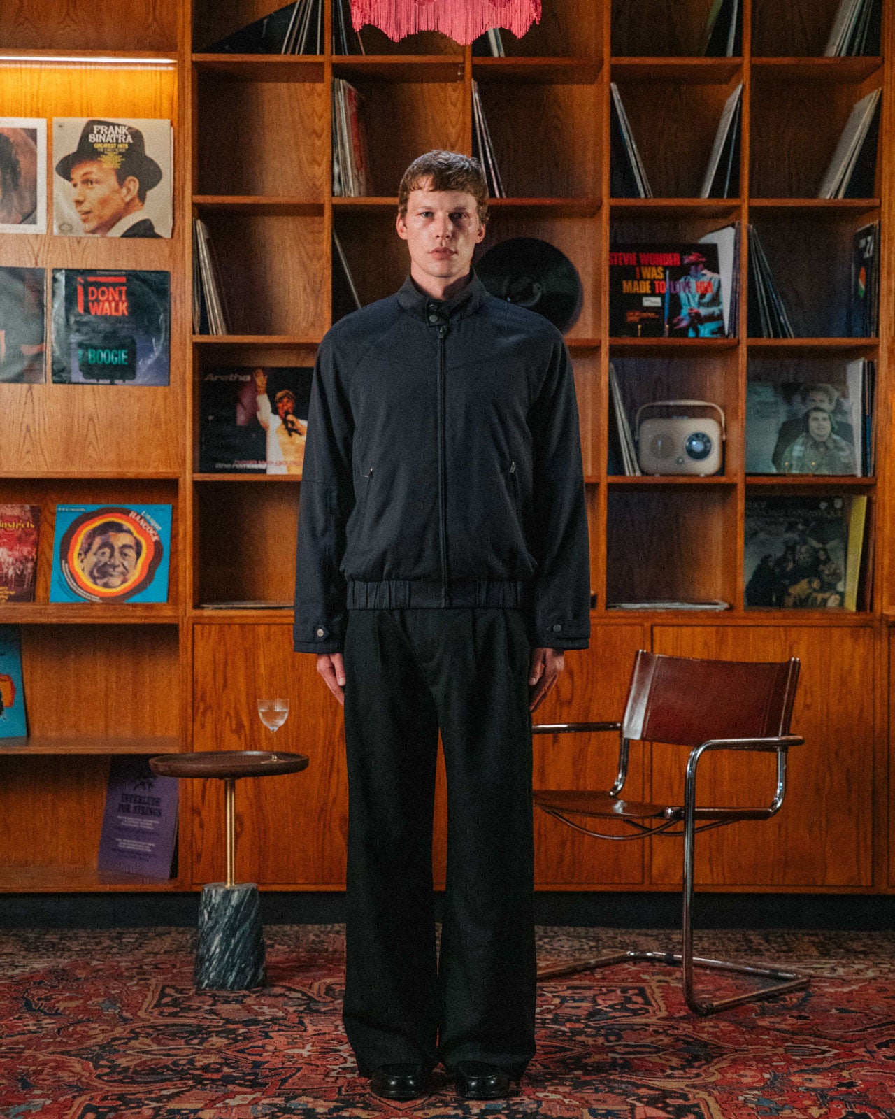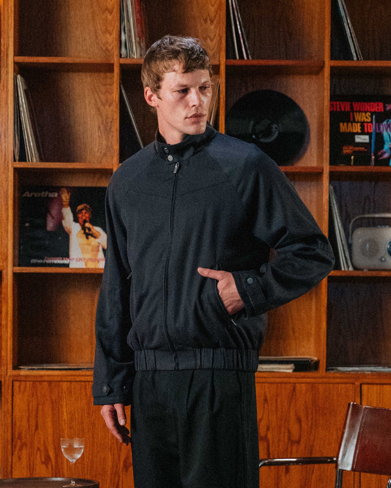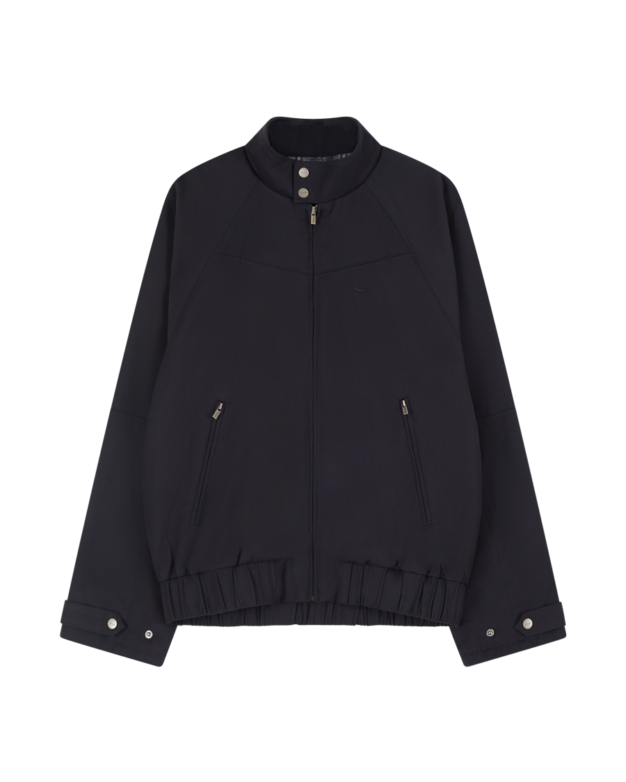 The jacket you wear to share gabagool with Tony Soprano. A high-neck track jacket with raglan sleeves, elevated by custom hardware and an adjustable waist buckle. Wear it unzipped to reveal the blue check lining. In homage to Alain Delon’s look in 'Once a Thief' (1965).