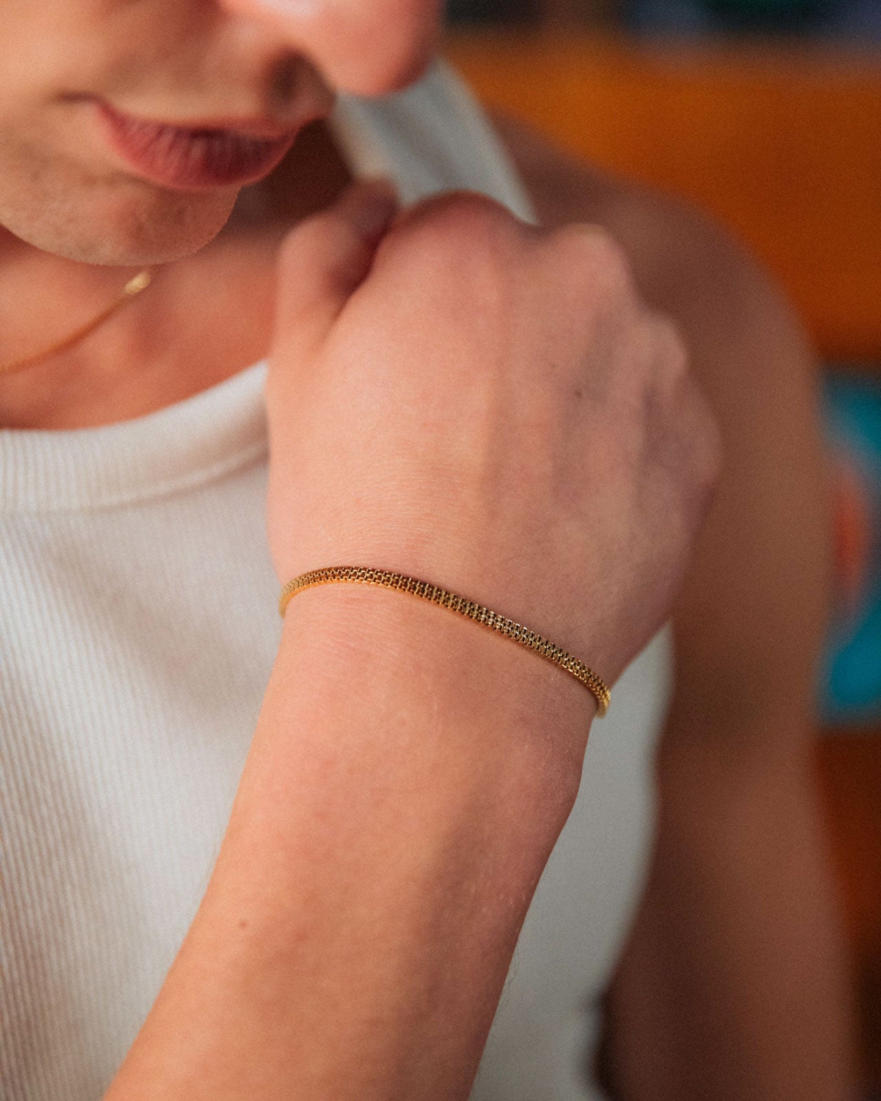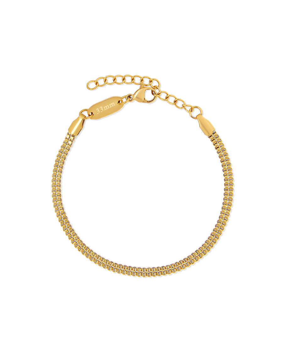 A double box chain bracelet that proves gentle is powerful. This fluid chain rests naturally, making it perfect for every day wear.