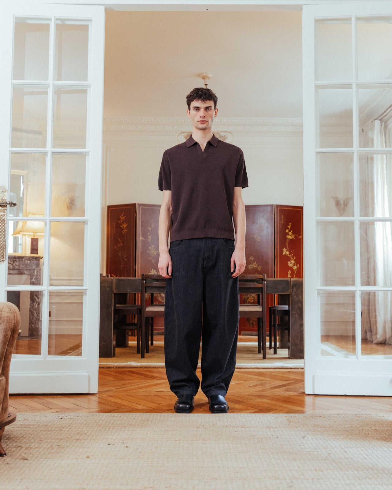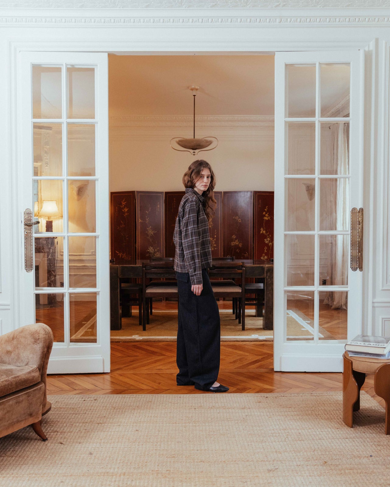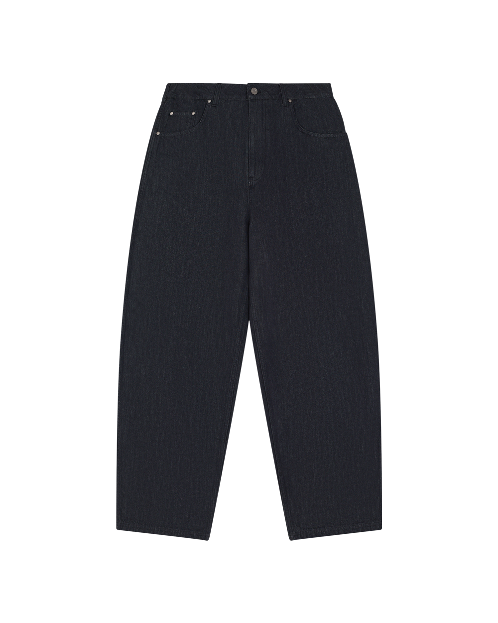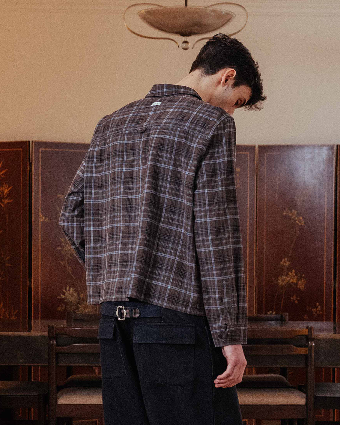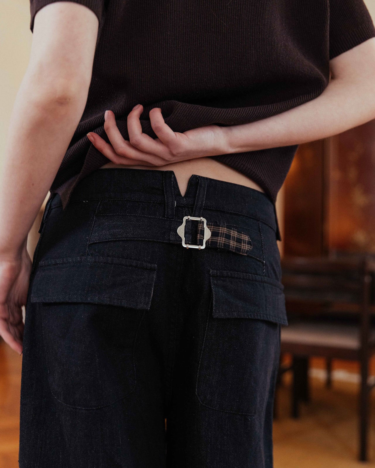 An everyday barrel-leg jean, finished with a check-lined waist adjuster at the reverse for a custom fit. Designed to add structure to every look, and completed with custom hardware and rivet detailing.